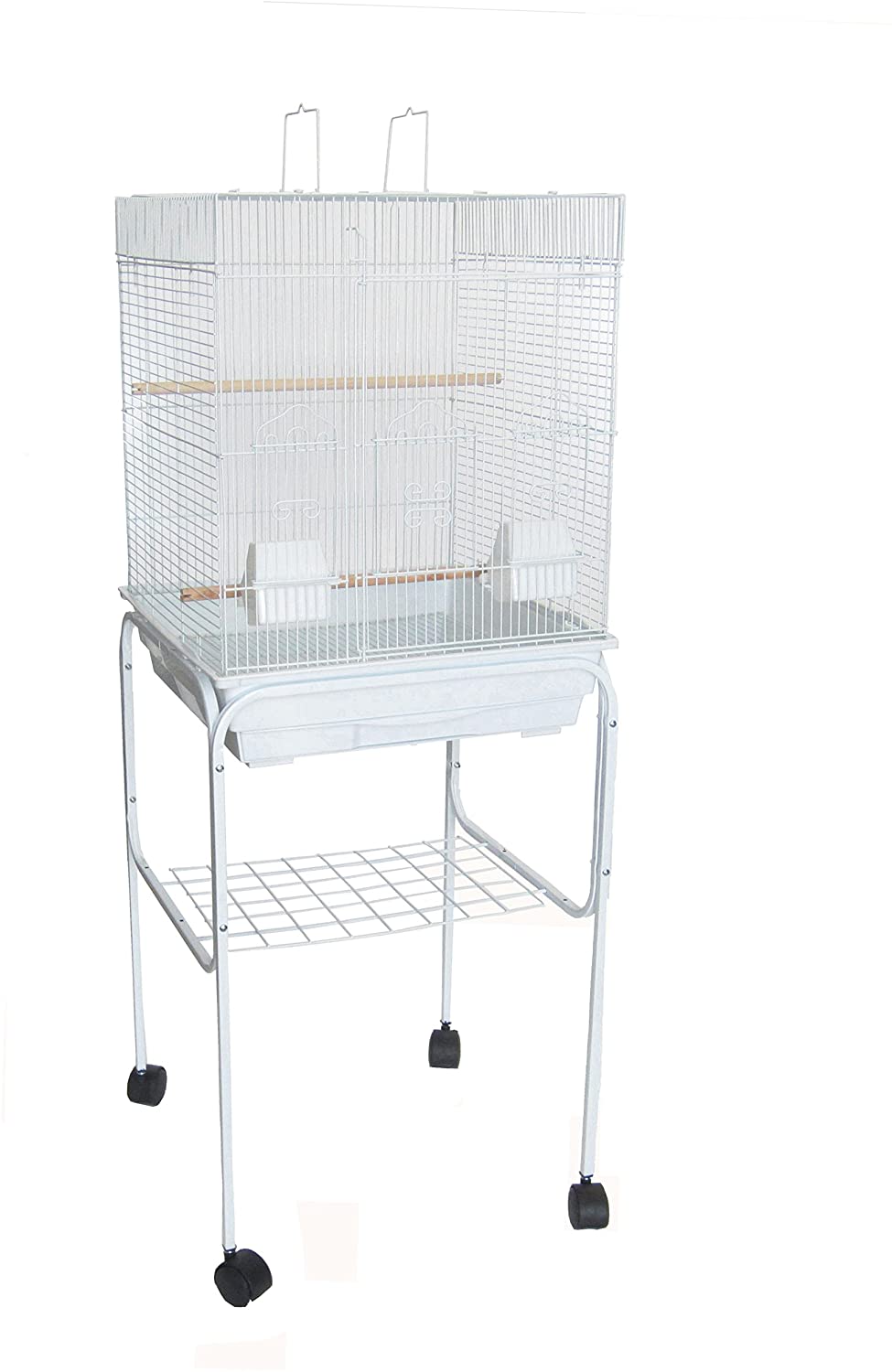 3/8" bar spacing flat top small bird cage - 18"x18" in black. It has large swing out door with door pin and small lift up door, 2 feeder doors and 2 cups, 2 perches, easy clean removable metal grate and slide out bottom plastic tray. This cage will come with stand in black. Dimension cage with stand is 18l x 18d x 44h inches and cage only is 18l x 18d x 23h.
